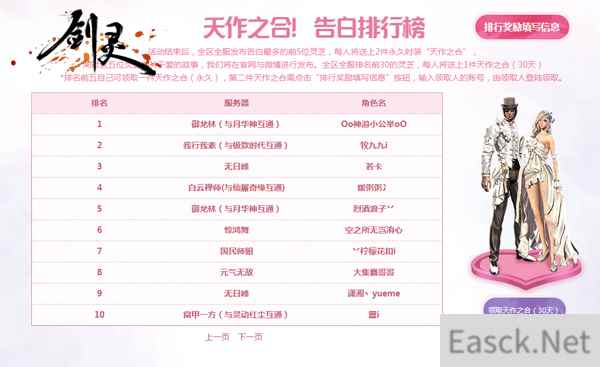 告白排行榜 一时间游戏内的情侣们纷纷get到这一秀恩爱新姿势,不但可以添购以及给心仪的TA赠送2019年情人节时装,还能参与活动进行爱的告白。活动期间内,有情人的勇敢告白在“爱的告白墙”上滚动刷新,让所有玩家都为这些真爱做了见证! 天作之合 爱TA请为TA披上婚纱 历时一个月,《剑灵》“心暖情人节”活动现已圆满落幕。根据活动规则,全区全服发布告白最多的前5位玩家,每人均获得了游戏送出的2件永久时装“天作之合”。除此之外,小编还特别联系到了部分获奖玩家,了解他们参与活动背后的,关于爱的故事。