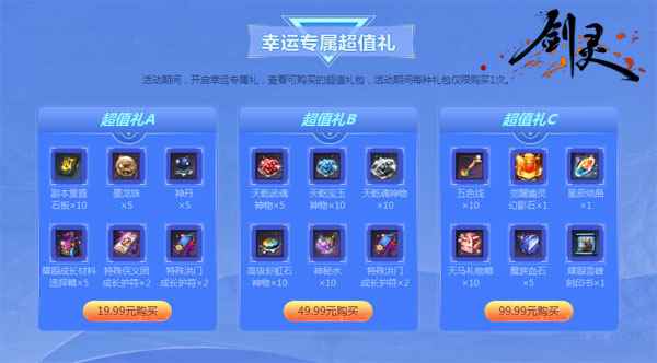 图3:2020新年福运礼 2020新年福运礼 限时获取珍稀道具 迈入2020年,《剑灵》又紧锣密鼓的为玩家们安排上了另外一波福利活动——2020新年福运礼!玩家可在购买时间内购买礼包,不同档次礼包可以叠加购买,每种礼包每个角色限购1次。之后就可以在奖励领取时间内,根据所购买的礼包,领取到相对应的奖励。这些奖励中不乏珍稀道具,如茉花相闻焕彩石、暗金流影套装、焱犇套装以及洪门雪峰大精气等,都是备受玩家追捧的好礼。