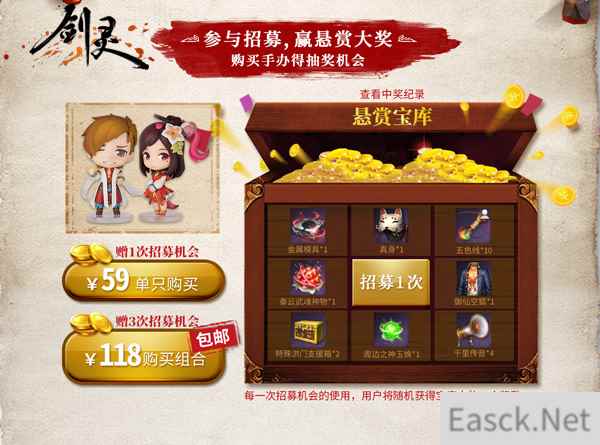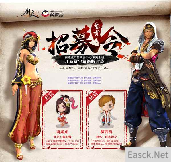 作品展示 成功“缉拿”赠招募机会 悬赏宝库开箱有礼 活动期间内,玩家成功“缉拿”悬赏令上的南素柔或啸四海中的任意一人,就赠送1次招募机会。若玩家将两人组合同时“缉拿”到手,既购买双人组合装,直接赠送3次招募机会。招募机会可在悬赏宝库中开启宝箱,每一次招募,必定获得宝库中的一个奖励,宝库藏品包括“真身”永久头饰、“御仙空狐”永久时装、周边之神玉焕等。