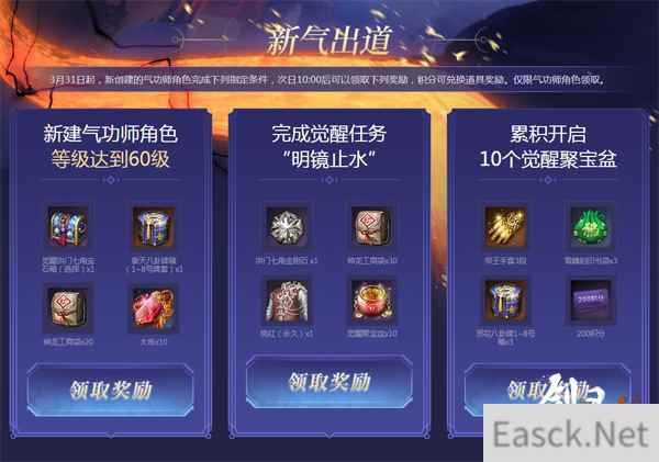 新气出道 伴随着阴阳派系的上线,觉醒预约活动也正式迈入了第二阶段——新气出道!“新气出道”的气功师达到60级后可领取丰厚奖励,完成觉醒任务后还有永久时装等送上,此外累积开启觉醒聚宝盆一定次数还有传说装备、传说八卦牌等。