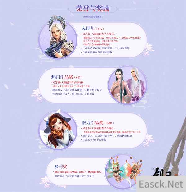 图5:荣誉与奖励 除此之外,早鸟会场还将评选出入围奖(2名)、热门作品奖(6名)、潜力作品奖(不限),每个荣誉的背后都伴随着相应的特权和游戏道具奖励,譬如热门作品奖获得者,将可以获得灵芝节-入围创作者早鸟特权,获邀加入“灵芝创作者计划”,获得扶持权益,其作品可以得到剑灵官方、腾讯视频等平台推荐,并且还可以领取到游戏与《三生三世枕上书》联动专属“三世灵缘”套装! 看到琳琅满目的奖品以及象征着荣耀的特权,是不是心动不已?那就赶快行动起来吧!《剑灵》第一届“灵芝节”内容生态盛典现已抢先启动早鸟会场,在这里,创意不再受限,有爱的玩家将被铭记,优质的、有潜力的创作者将被发掘和扶持,与《剑灵》一起共创崭新的篇章。 |