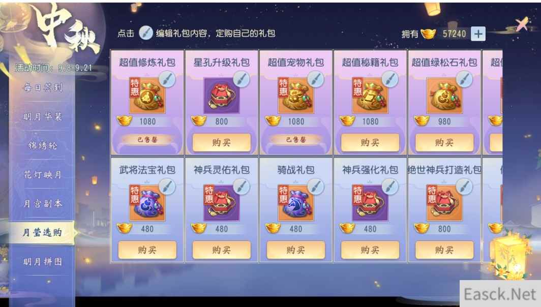 【月莹选购,限时回馈】 中秋活动期间,无双世界将为大家带来更多超值优惠。多种数值礼包将特价上架,回馈给一直支持无双的各位少侠,祝愿大家快乐度中秋。当第二周更新后礼包上限将会刷新,届时少侠们还可再次购买心仪礼包。限时回馈,机不可失,少侠们若有中意的礼包,趁此机会赶紧拿下!