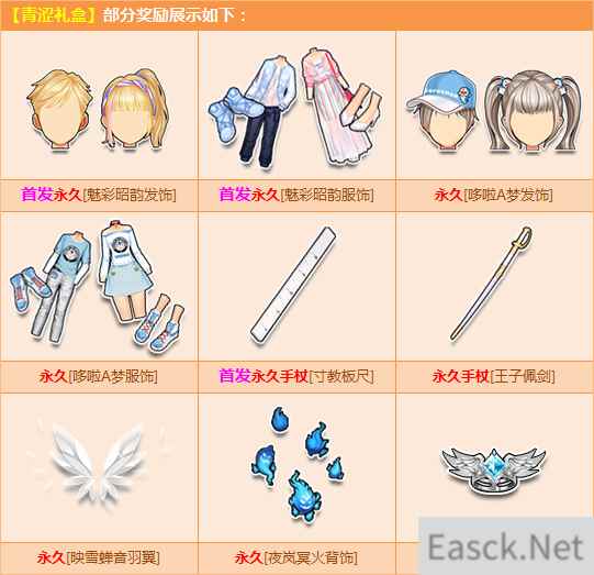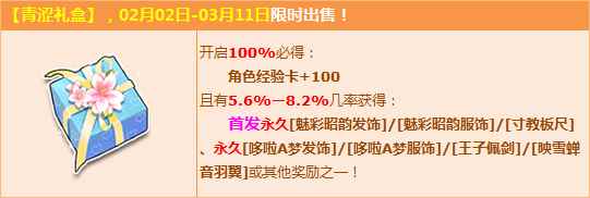 购【青涩礼盒】,必得角色经验卡+100,且有几率获得首发永久【魅彩昭韵发饰】/【魅彩昭韵服饰】/【寸教板尺】、永久【哆啦A梦发饰】/【哆啦A梦服饰】/【王子佩剑】/【映雪蝉音羽翼】或其他奖励之一!
