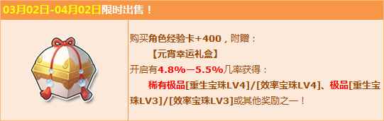 活动期间,购【角色经验卡+400】,附赠元宵幸运礼盒,获赠稀有极品【重生宝珠LV4】/【效率宝珠LV4】、极品【重生宝珠LV3】/【效率宝珠LV3】或其他奖励之一!
