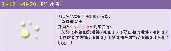 盛夏萤火虫 活动时间:3月12日-4月20日 活动地址:游戏商城 一、活动内容 购买角色经验卡+300,获赠:盛夏萤火虫,开启有几率获得:永久【冬锦如歌发饰/礼服】/【夏日和风发饰/服饰】/【立秋麦笙发饰/服饰】/【景春丽鸳发饰/服饰】或其他奖励之一! 极品概率范围为:5.2%-6.8% 非极品概率范围为:93.2%-94.8%