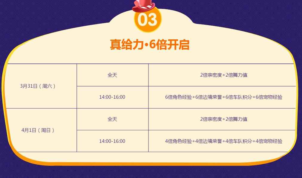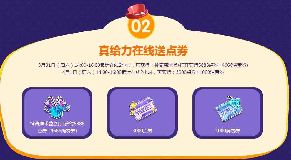 3月31日(周六)14:00-16:00累计在线2小时,可获得:神奇魔术盒(打开获得5888点券+4666消费券)4月1日(周六)14:00-16:00累计在线2小时,可获得:3000点券+1000消费券