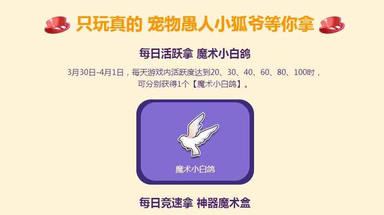 3月30日-4月1日,每天游戏内活跃度达到20、30、40、60、80、100时,