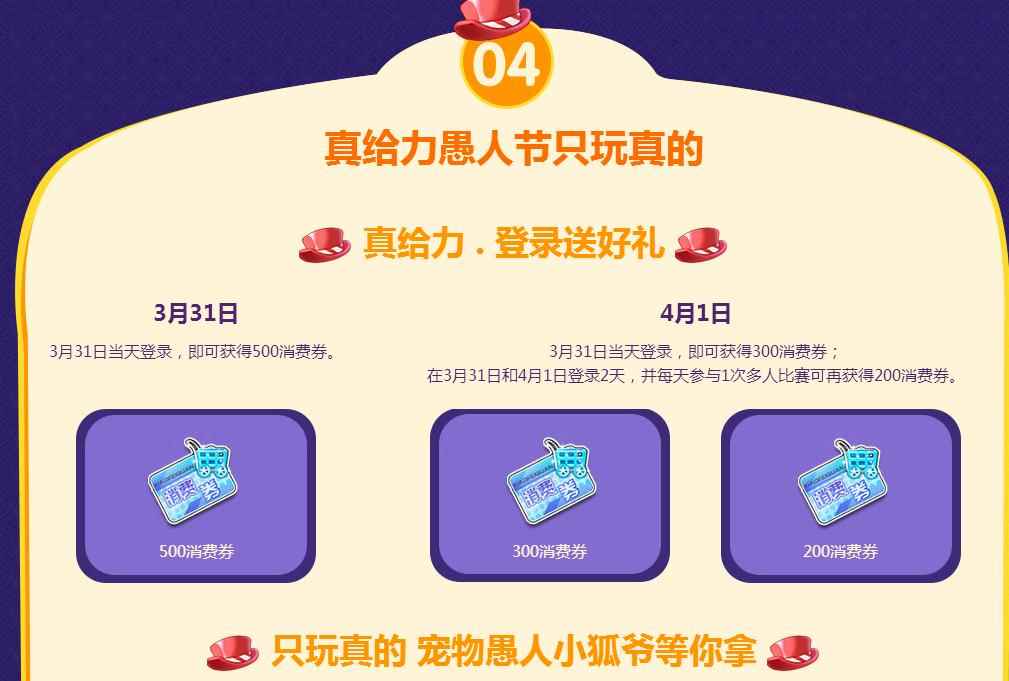 在3月31日和4月1日登录2天,并每天参与1次多人比赛可再获得200消费券。