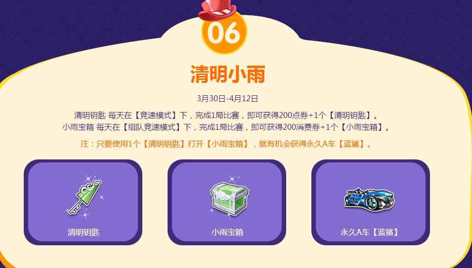 清明钥匙 每天在【竞速模式】下,完成1局比赛,即可获得200点券+1个【清明钥匙】。