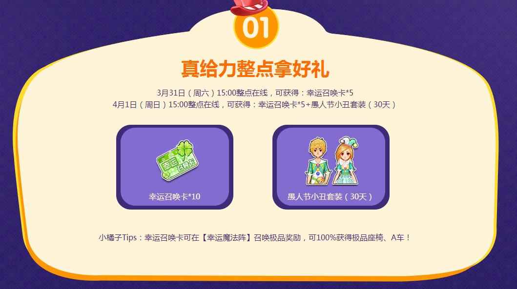 4月1日(周日)15:00整点在线,可获得:幸运召唤卡*5+愚人节小丑套装(30天)