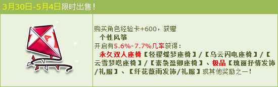 春日放飞个性风筝,四款永久双人座椅任你选!活动期间,凡购买【角色经验卡+600】将附赠个性风筝,开启即可有机会获得永久双人座椅、永久发饰、永久套装等极品奖励。