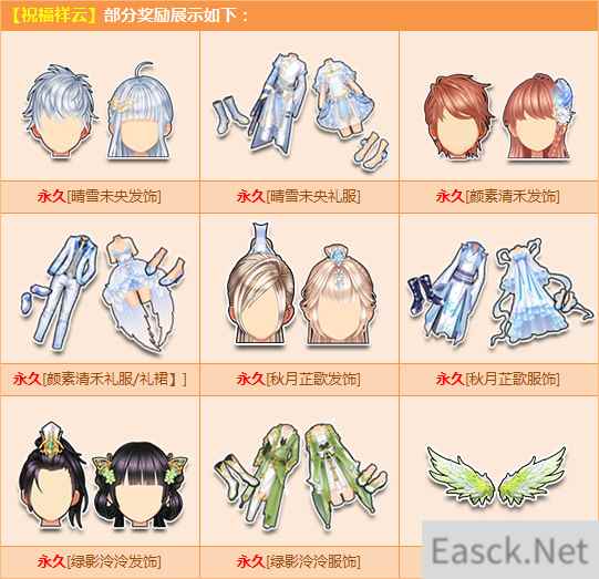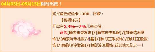 购买角色经验卡+300,必得【祝福祥云】,且有机会得永久【晴雪未央发饰】/【晴雪未央礼服】/【颜素清禾发饰】/【颜素清禾礼服/礼裙】/【秋月芷歌发饰】/【秋月芷歌服饰】/【绿影泠泠发饰】/【绿影泠泠服饰】或其他奖励之一!