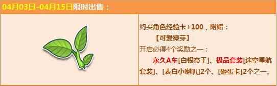 购【角色经验卡+100】,必得【可爱绿芽】,且有几率必得4个奖励之一:极品A车【白银帝王】、极品【迷空星航套装】、【表白小喇叭】2个、【砸蛋卡】2个!