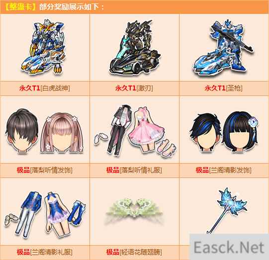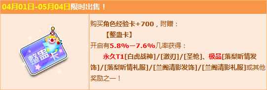 整蛊卡 活动时间:4月1日-5月4日 活动地址:游戏商城 一、活动内容 活动期间,购【角色经验卡+700】,必得【整蛊卡】,有机会得永久T1【白虎战神】/【激刃】/【圣枪】、极品【落梨听情发饰】/【落梨听情礼服】/【兰阁清影发饰】/【兰阁清影礼服】或其他奖励之一! 极品概率范围为:5.8%-7.6% 非极品概率范围为:92.4%-94.2%