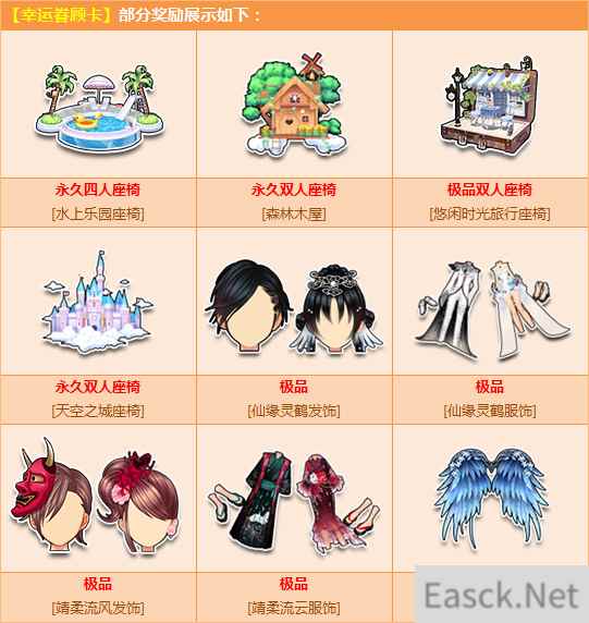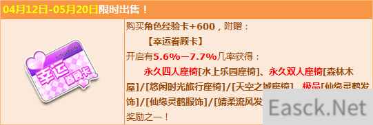 购【角色经验卡+600】,必得幸运眷顾卡,有机会得永久四人座椅【水上乐园座椅】、永久双人座椅【森林木屋】/【悠闲时光旅行座椅】/【天空之城座椅】、极品【仙缘灵鹤发饰】/【仙缘灵鹤服饰】/【靖柔流风发饰】/【靖柔流风服饰】或其他奖励之一!