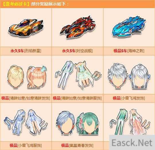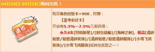 活动期间,凡购【角色经验卡+900】,附赠逢考必过卡,有机会得永久S车【烈焰新星】/【时空战舰】/【海神之刺】、极品【清辞如意/如意清辞发饰】/【清辞如意/如意清辞服饰】/【小雪飞鸿发饰】/【小雪飞鸿服饰】或其他奖励之一!
