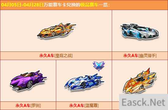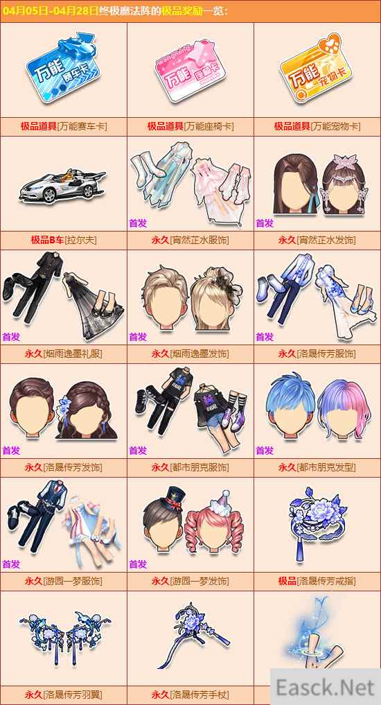 终极魔法阵 活动时间:4月5日-28日 活动地址:游戏内终极魔法阵活动界面 一、活动内容 使用终极召唤卡召唤极品道具,即有机会赢取极品道具【万能赛车卡】/【万能座椅卡】/【万能宠物卡】,以及【宵然芷水服饰】/【烟雨逸墨礼服】/【洛晟传芳服饰】等人气服饰及发饰。 使用对应的万能卡片,即可在兑换商店中兑换永久A车【皇庭之战】/【幽灵猎手】/【罗刹】、极品双人座椅【森林木屋】/【花晴依恋单车】/【圣光之心飞椅】、极品宠物【胜利天使】/【小王子】等稀有奖励。