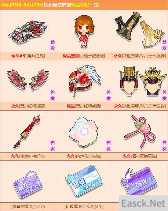 钻石魔法阵 活动时间:4月5日-4月28日 活动地址:游戏内 一、部分奖励