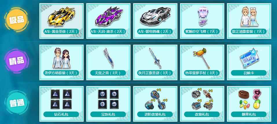 4、活动期间内,3月14日后登录过游戏且在4月4日后未登录游戏的玩家,每天登录游戏,即可从下列极品、精品、普通道具中各选择1件领取,每件道具仅限领取1次。