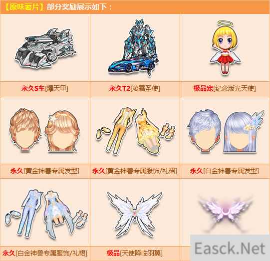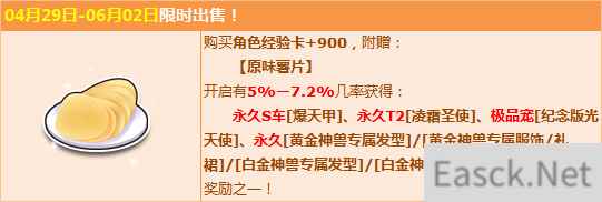 购买角色经验卡+900,必得原味薯片,有机会得永久S车【爆天甲】、永久T2【凌霜圣使】、极品宠【纪念版光天使】、永久【黄金神兽专属发型】/【黄金神兽专属服饰/礼裙】/【白金神兽专属发型】/【白金神兽专属服饰/礼裙】或其他奖励之一!