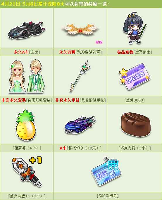 4月21日至5月6日期间,登录游戏即可获得相应奖励。