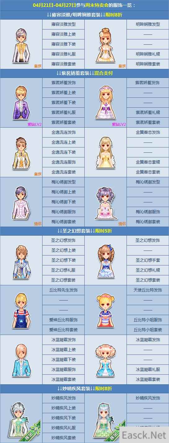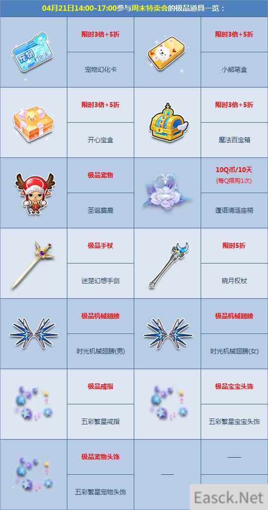 4月21日-4月27日期间,周末特卖会惊喜登场,【小熊笔盒】等宝箱限时5折+3倍极品概率,极品【雍容淡雅/明眸娴雅套装】限时8折,【圣之幻想套装】限时5折,还有其他各式好礼等你来!