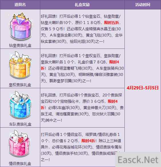 4月29日-5月5日,人气贵族礼包【钻皇贵族礼盒】、【皇权贵族礼盒】、【车队贵族礼盒】、【情侣贵族礼盒】限时最低4折出售。最低只需36Q币,开启可100%获得极品S车【幽浮】、极品双人座椅【骆宾水晶王座】/【花海连城花环】/【翎蓝奢疑飞椅】、专属A车、极品套装、钻皇宝石等稀有奖励!