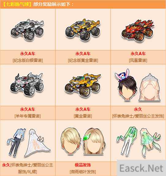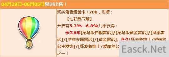 活动期间,购【角色经验卡+700】,必得七彩热气球,有机会得永久A车【纪念版白银雷诺】/【纪念版黄金雷诺】/【凤凰雷诺】/【羊年专属雷诺】/【黄金雷诺】、永久【怀表兔绅士/爱丽丝公主发饰】/【怀表兔绅士/爱丽丝公主服饰/礼裙】或其他奖励之一!