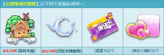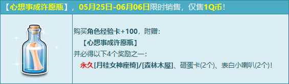 活动期间,购买角色经验卡+100,赠送【心想事成许愿瓶】,必得4个奖励之一:永久双人座椅【月桂女神座椅】/【森林木屋】、表白小喇叭、砸蛋卡!