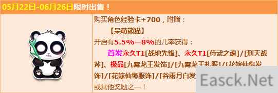 购【角色经验卡+700】,必得呆萌熊猫,有机会得首发永久T1【战地先锋】、永久T1【侍武之魂】/【刑天战斧】、极品【九霄龙王发饰】/【九霄龙王礼服】/【花嫁仙缘发饰】/【花嫁仙缘服饰】/【谷雨月白发饰】/【谷雨月白礼服/礼裙】或其他奖励之一!