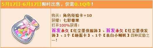 七彩糖果送惊喜 0.1Q币抢首发永久服饰!活动期间,凡购买【角色经验卡+10】将附赠七彩糖果,开启必得首发永久【红尘墨侠服饰】、首发永久【红尘墨侠发饰】、1个【砸蛋卡】、1个【表白小喇叭】四种奖励之一!下面一起来看看吧。
