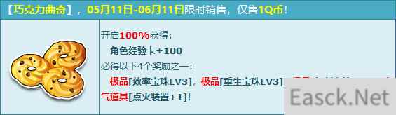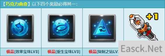 购买角色经验卡+100,必得【巧克力曲奇】,额外必得4个奖励之一:【点火装置+1】1个、【效率宝珠LV3】1个、【重生宝珠LV3】1个、【复制之钻LV3】1个!