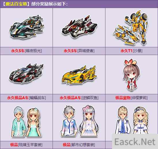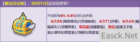 购【魔法百宝箱】,开启即有6%-8.6%的机会获得:永久S车【暗夜极光】/【异域使者】、永久T1【沙暴】、永久极品A车【蝙蝠战车】、永久极品A车【逆鳞双鱼】、极品宠【绯樱萝莉】、极品【琉璃玉芊套装】/【都市幻想套装】/【海影沉风套装】!