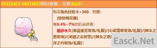 香甜软软棉花糖,3Q币抢永久婚纱套装!活动期间,凡购买【角色经验卡+300】将附赠软软棉花糖,开启即可有机会获得永久婚纱系列服饰、极品羽翼。下面一起来看看吧。