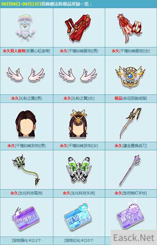 高级魔法阵 活动时间:6月6日-6月15日 活动地址:游戏内 一、高级魔法阵极品奖励
