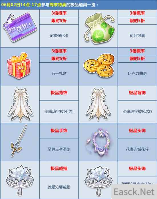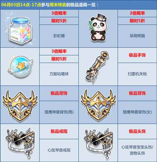 6月2日-3日期间固定时间段,人气道具【荷叶锦囊】、【五一礼盒】、【呆萌熊猫】、【彩虹糖】等人气道具限时5折低价出售,更有3倍极品爆率。