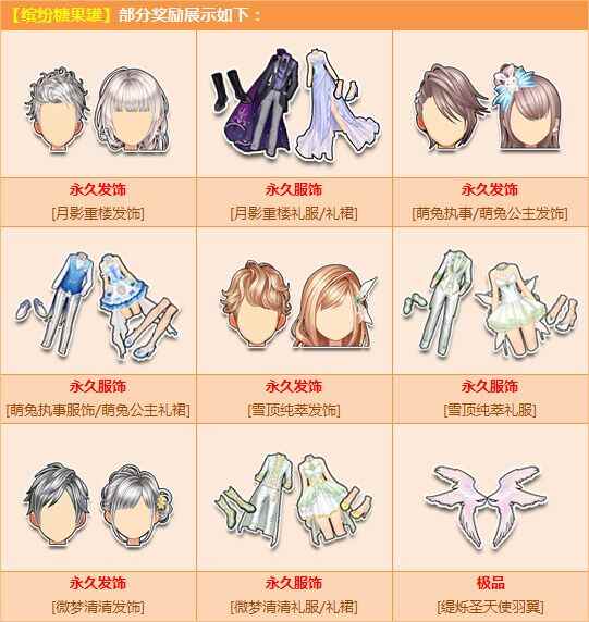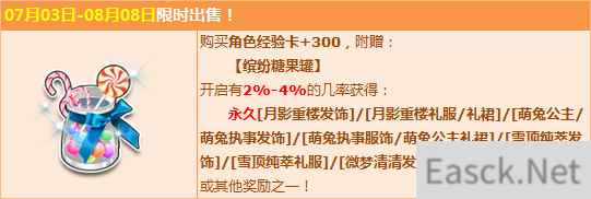 活动期间,购【角色经验卡+300】,赠送【缤纷糖果罐】,有机会得永久【月影重楼发饰】/【月影重楼礼服/礼裙】/【萌兔公主/萌兔执事发饰】/【萌兔执事服饰/萌兔公主礼裙】/【雪顶纯萃发饰】/【雪顶纯萃礼服】/【微梦清清发饰】/【微梦清清礼服/礼裙】或其他奖励之一!