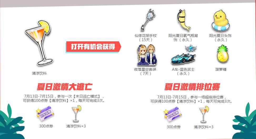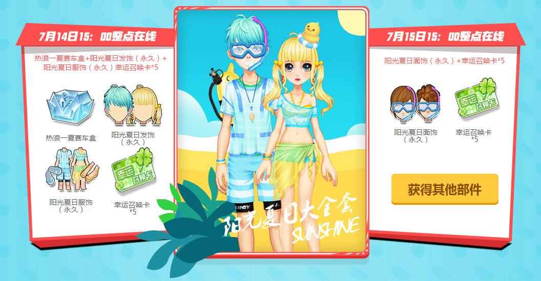 7月14日15:00整点在线:热浪一夏赛车盒+阳光夏日发饰(永久)+阳光夏日服饰(永久)幸运召唤卡*5