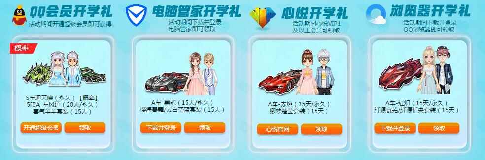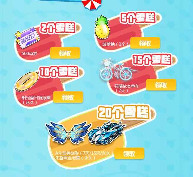 《QQ飞车》缤纷暑假,热浪一夏。分享活动页面给好友,好友进入页面即可获得一个雪糕,累计一定数量即可获得A车蓝兽剑影、永久羽翼等道具奖励。整点在线可获得永久阳光夏日套装、热浪一夏赛车盒等奖励。