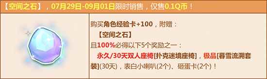 0.1Q币抢永久双人扑克迷境座椅!活动期间,凡购买【角色经验卡+100】将附赠空间之石,开启即可有机会获得永久双人座椅、极品套装等丰厚奖励。下面一起来看看吧。