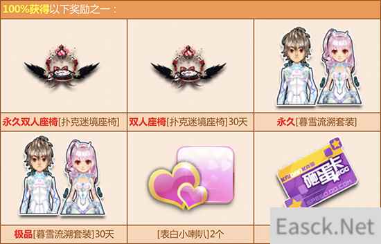 活动期间,开启【空间之石】可以必得4个奖励之一:永久双人座椅【扑克迷境座椅】、极品【暮雪流溯套装】、表白小喇叭、砸蛋卡!千万不能错过哦!