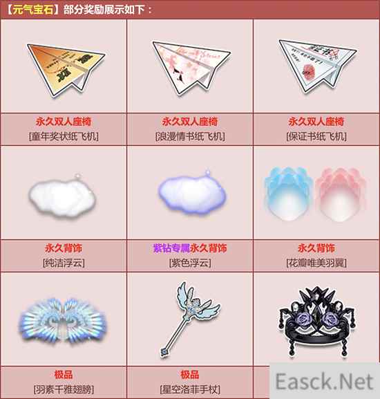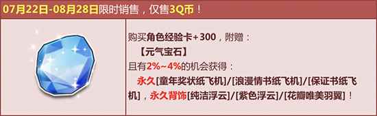 活动期间,购买角色经验卡+300,赠送【元气宝石】,有机会得永久【童年奖状纸飞机】/【浪漫情书纸飞机】/【保证书纸飞机】,永久背饰【纯洁浮云】/【紫色浮云】/【花瓣唯美羽翼】!或其他奖励之一!