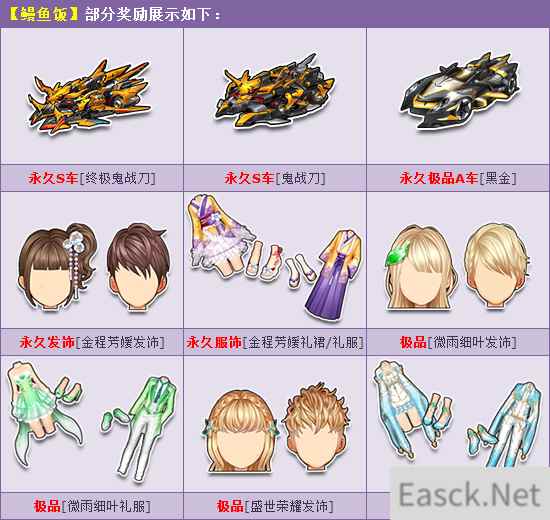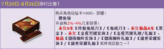 活动期间,购买角色经验卡+900,获赠:鳗鱼饭,开启有几率获得:永久S车【终极鬼战刀】/【鬼战刀】、永久极品A车【黑金】、永久【金程芳媛发饰】/【金程芳媛礼裙/礼服】、极品【微雨细叶发饰】/【微雨细叶礼服】/【盛世荣耀发饰】/【盛世荣耀礼服】或其他奖励之一!