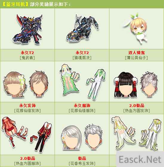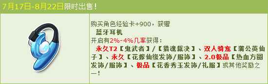 购买角色经验卡+900,获赠:蓝牙耳机,开启有几率获得:永久T2【鬼武者】/【猎魂裁决】、双人骑宠【蒲公英仙子】、永久【花嫁仙缘发饰/服饰】、2.0极品【热血方圆发饰/服饰】、极品【花香秀玉发饰/礼服】或其他奖励之一!