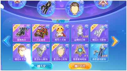 点击“抽1次”和“抽10次”可以分别从下方的奖池中随机获得1个和10个奖励,同时可分别使进度条积累1点进度和10点进度。