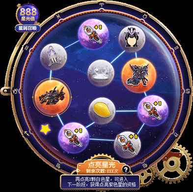 每天完成任务,可获得【点星次数】,使用点星次数,即可点亮一次星,概率获得以下奖励!点星必须按照银星-紫星-金星的顺序点亮,需要在每个阶段点亮指定数量的星,才可以进入下一阶段!