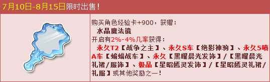水晶魔法镜 活动时间:7月10日-8月15日 活动地址:游戏商城 一、活动内容 活动期间,购买角色经验卡+900,获赠:水晶魔法镜,开启有2%-4%几率获得:永久T2【战争之主】、永久S车【绝影神驹】、永久5喷A车【蝙蝠战车】、永久【黑曜晨光发饰】/【黑曜晨光礼裙/服饰】、极品【星昭嫣灵发饰】/【星昭嫣灵礼裙/礼服】或其他奖励之一! 核心极品期限型概率范围为:4%-6% 核心奖励永久型概率范围为:2%-4% 非核心奖励概率范围为:90%-94%