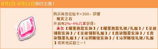 购买角色经验卡+300,获赠:现实之石,开启有几率获得:永久【曜墨逸歌发饰】/【曜墨逸歌礼裙/礼服】/【圣殿翎影发饰】/【圣殿翎影礼服】/【贵柒黯墨发饰】/【贵柒黯墨礼服】/【沁溟随缘发饰】/【沁溟随缘礼裙/礼服】或其他奖励之一!