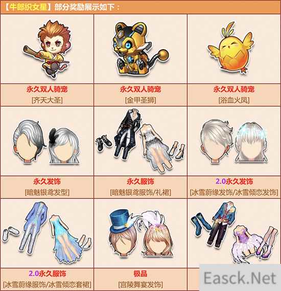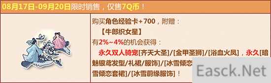 活动期间,购买角色经验卡+700,附赠【牛郎织女星】,有机会得双人骑宠【齐天大圣】/【金甲圣狮】/【浴血火凤】、永久【暗魅银鸢发型/礼裙/服饰】/【冰雪倾恋发饰】/【冰雪蔚缘发饰】/【冰雪倾恋套裙】/【冰雪蔚缘服饰】或其他奖励之一!