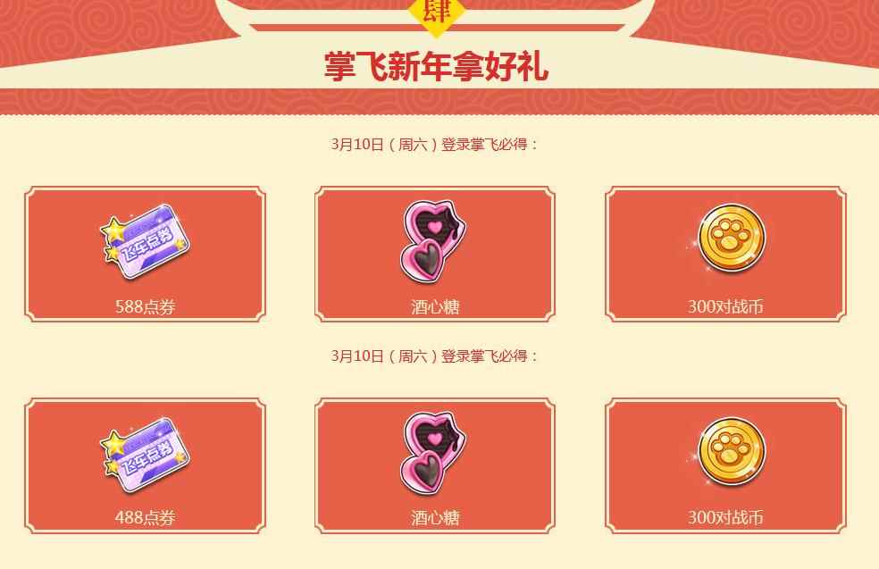 3月10日(周六)登录掌飞必得: